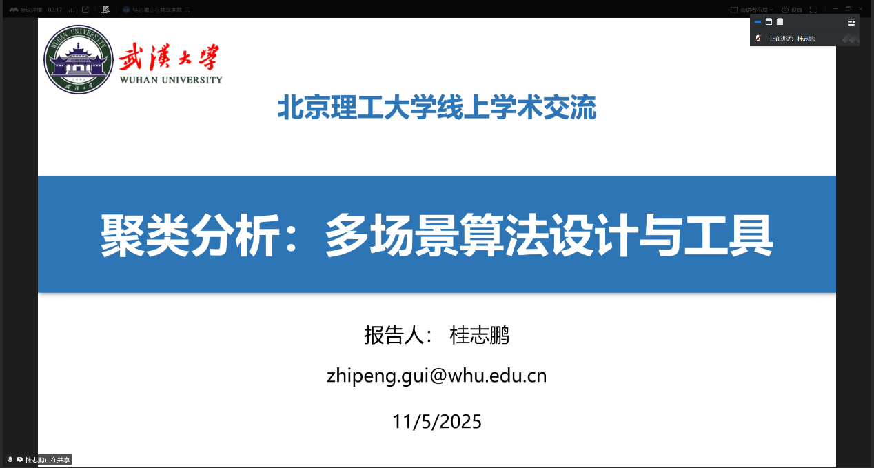 应皇冠体育官网-体育竞猜推荐-最新赛事赔率趋势 邀请,2025年11月5日,武汉大学遥感信息工程学院副院长桂志鹏教授在线上作题为“聚类分析——多场景算法设计与工具包研发”学术报告,皇冠体育 数据科学与知识工程研究所部分师生参加了讲座。